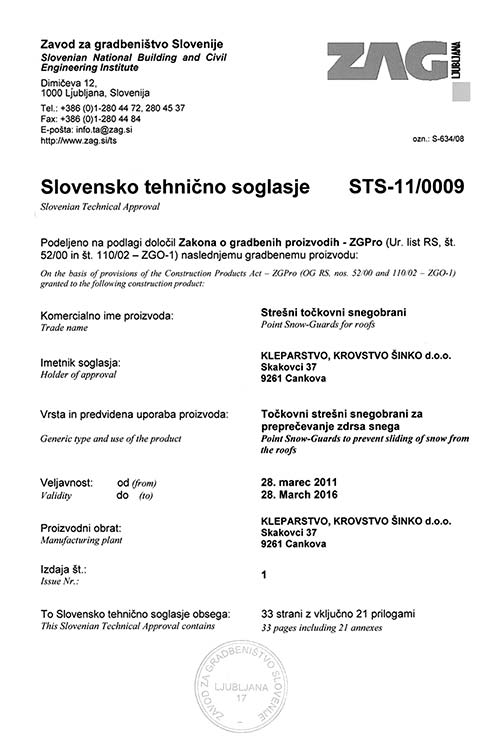 Technische Zustimmung für Schneenasen verliehen vom Slovenian National Building und Civil Engineering Institute